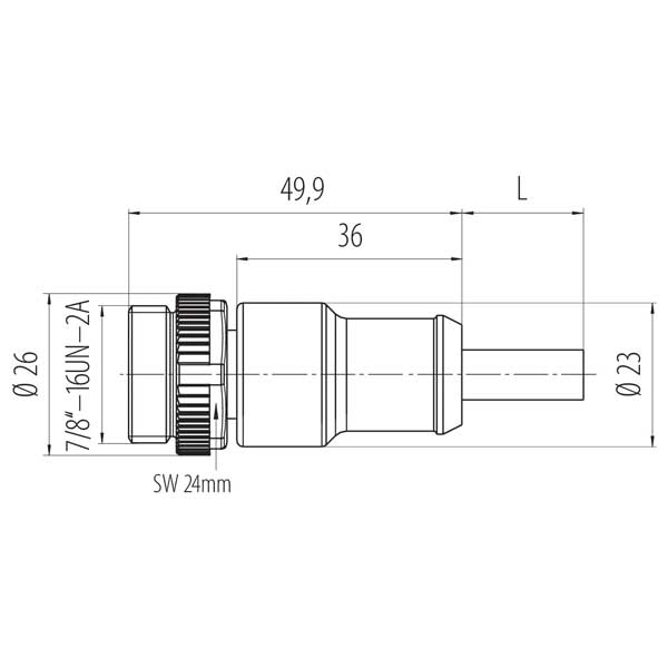 Binder 7/8" Kabelstecker Serie 870 mit UL-Zulassungen. 7/8 Zoll-16 UN Schraubverriegelung, wahlweise 3, 4 oder 5-polig. Schutzart IP68, ungeschirmt. Bemessungsspannung 300V (UL 600V). PUR-Kabel schwarz angespritzt, AWG 16, verfügbar in 2m, 5m oder 10m Kabellänge. Stecker-Bauform, am Kabel angespritzt. Mantelmaterial PUR schwarz. Technische Daten gemäß Herstellerangaben Binder Serie 870 mit UL-Zulassungen.